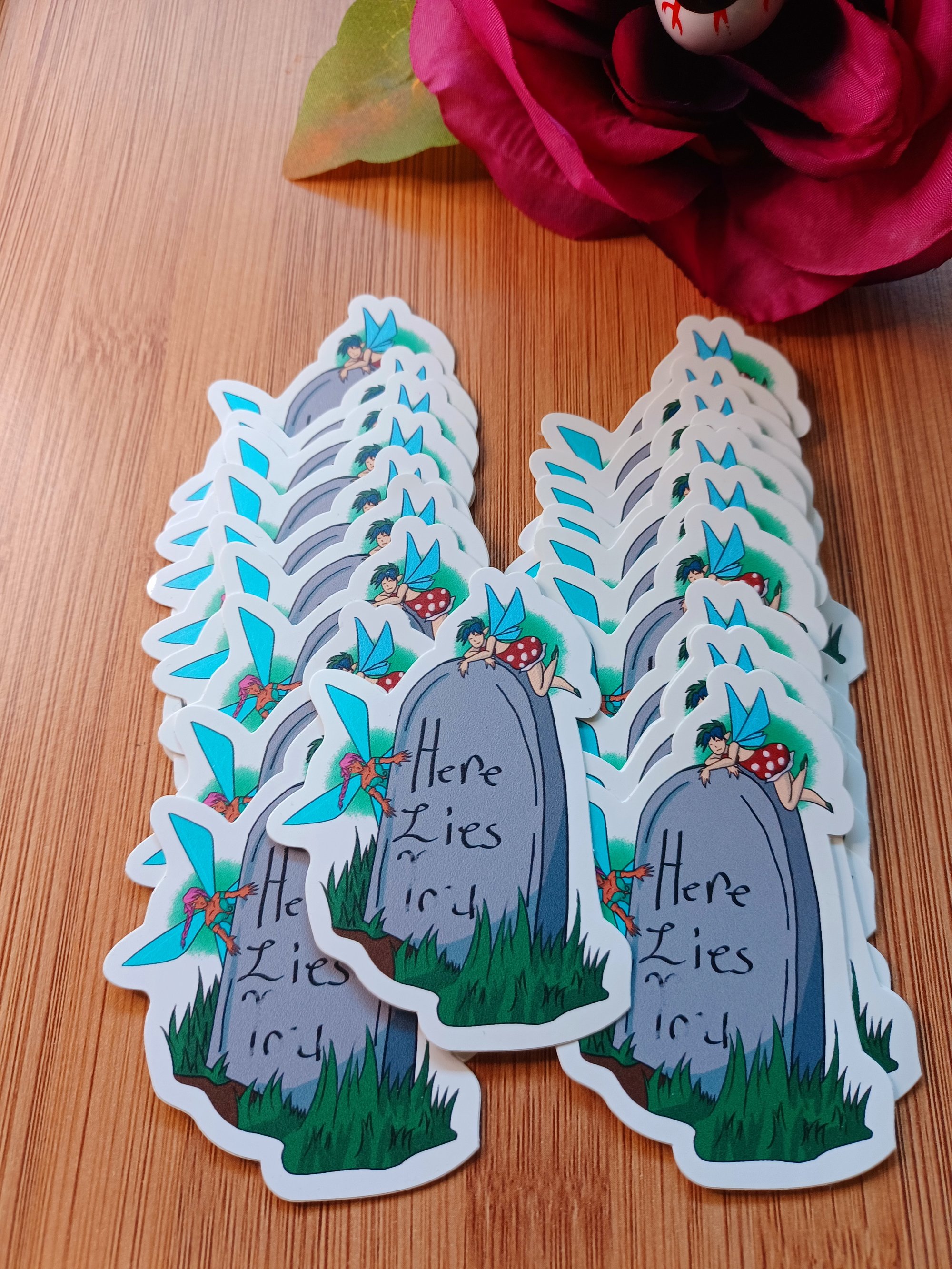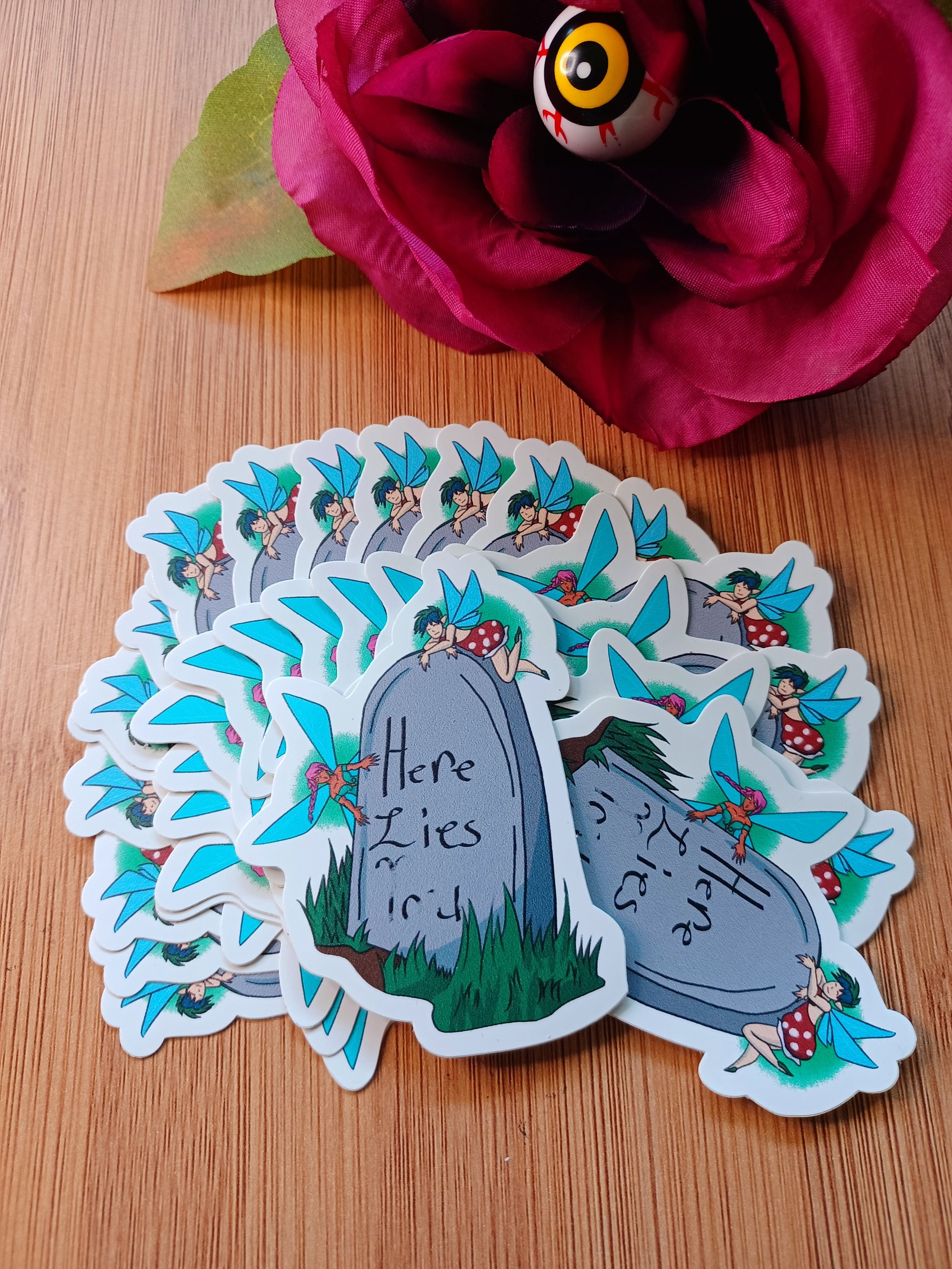 Faries on a gravestone with a worn epitath. Sticker is approximately 2 inches with a matte finish.