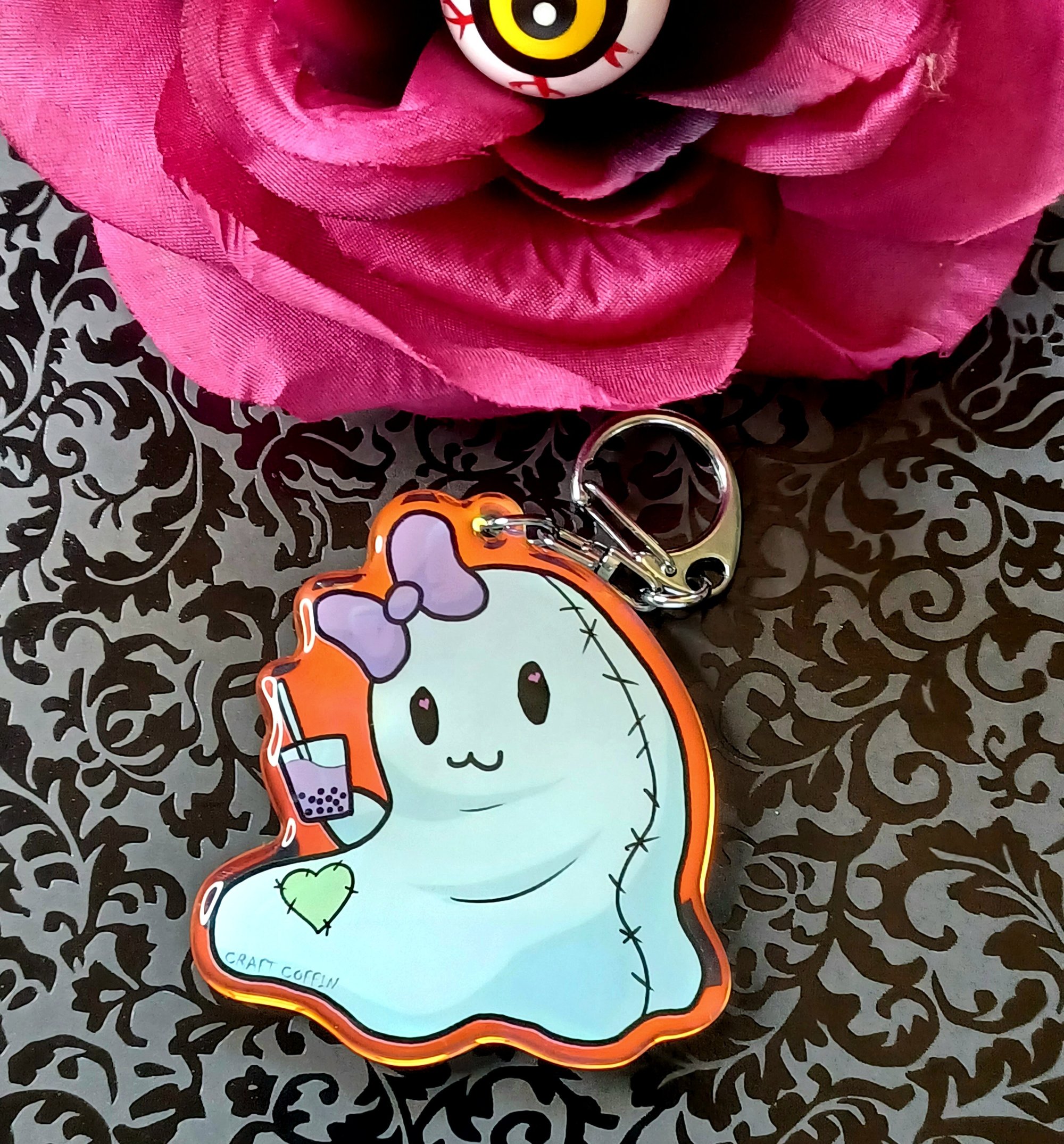 This acrylic keychain is approximately 2 1/2 inches by 2 inches wide and features a shiny holographic finish that shifts in the light. Art by Zaira.
