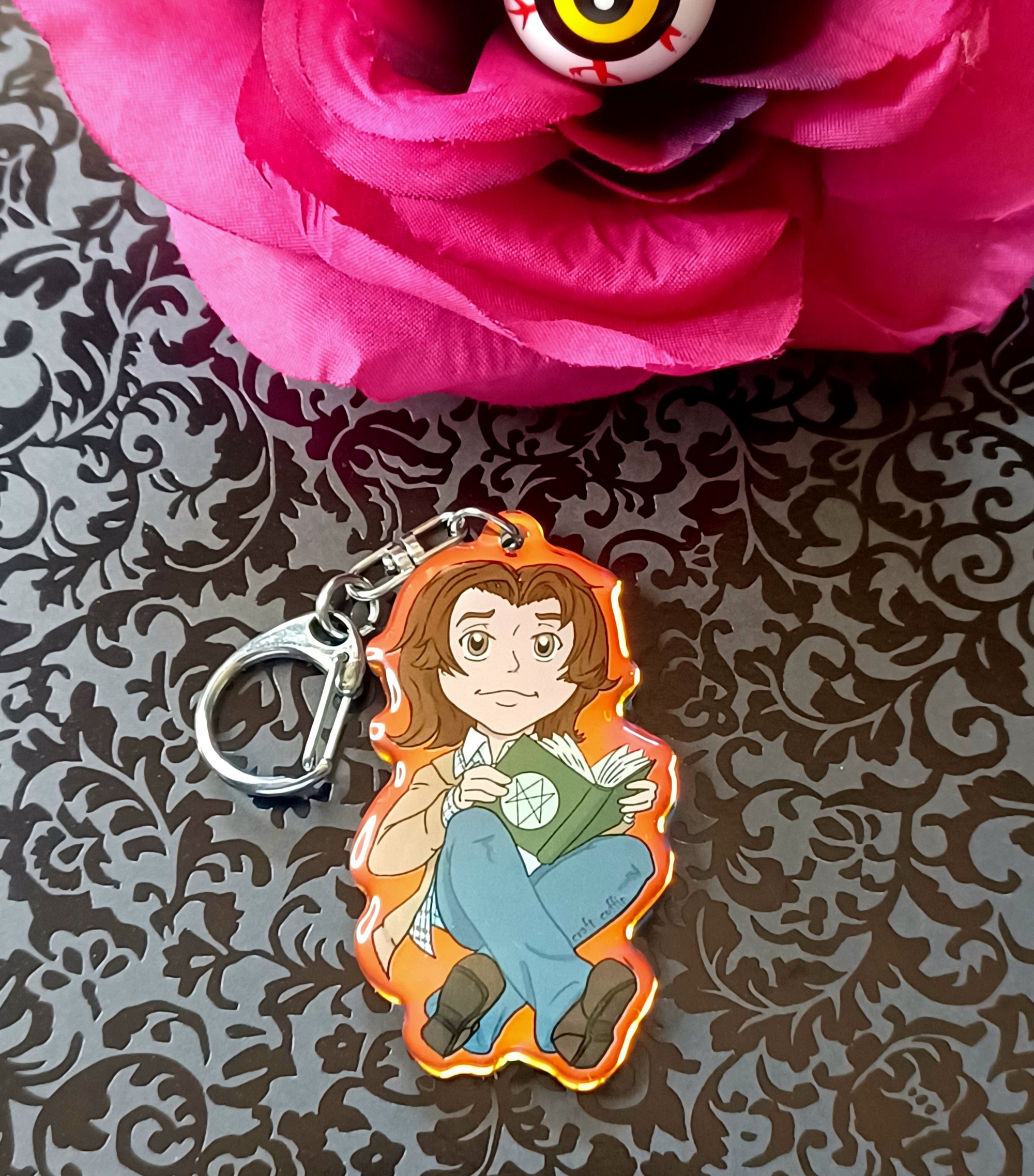 This acrylic keychain is approximately 2 1/2 inches tall by 1 1/2 inches wide and features a shiny holographic finish that shifts in the light. Art by Zaira.
